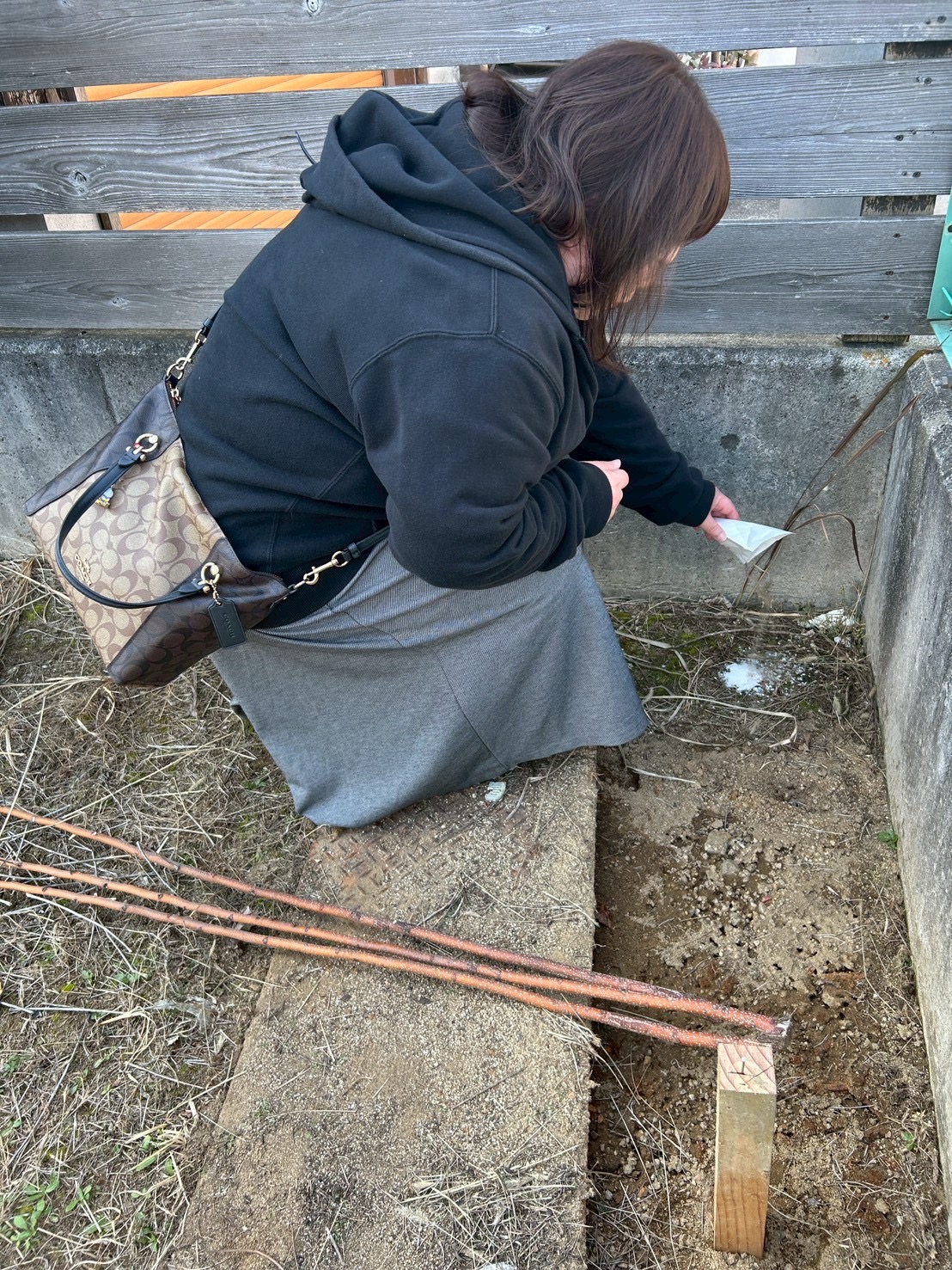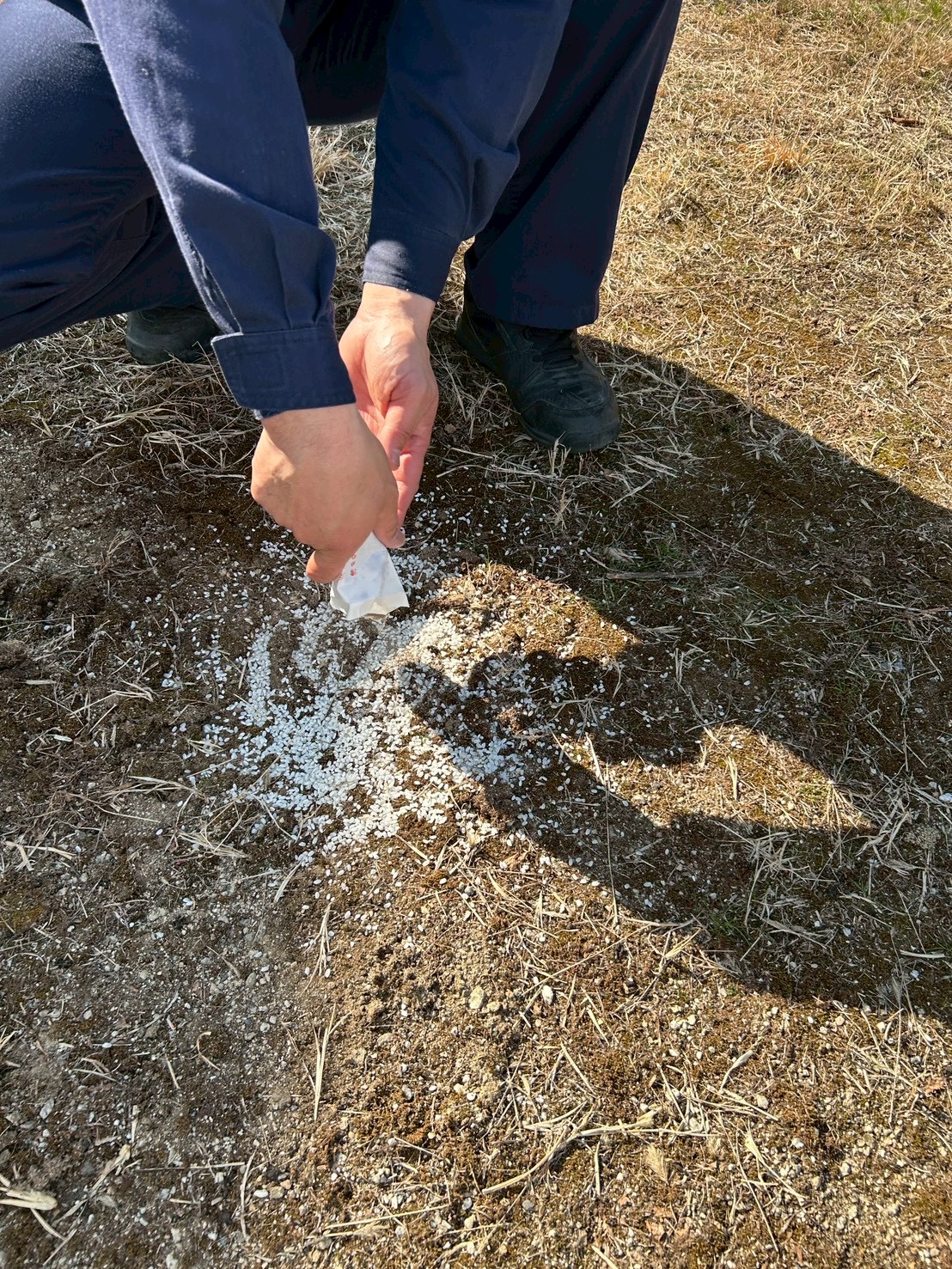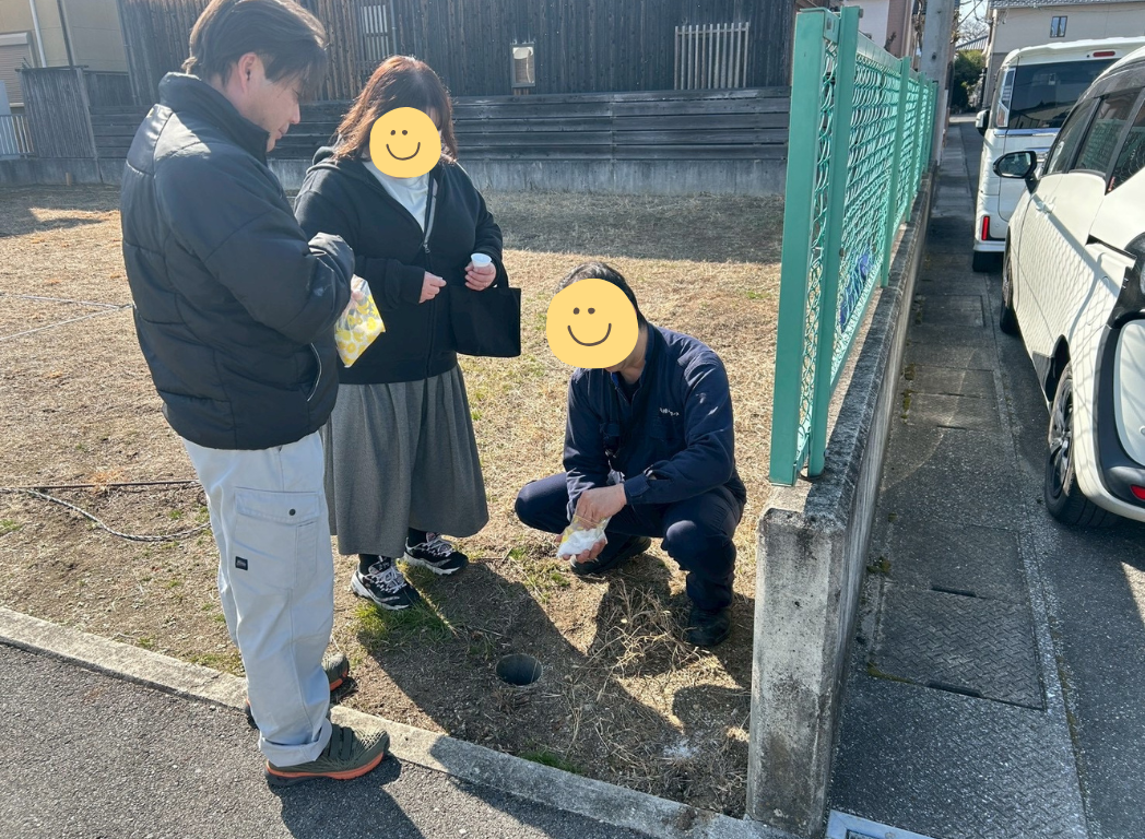 お土地の四方にお清めのお酒・お米・塩をまき、これから始まる工事の安全やI様の生活が穏やかに過ごせるよう